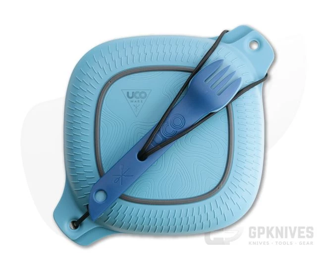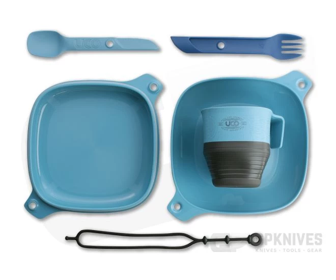 The UCO Six Piece Mess Kit is a lightweight, durable, functional and stylish mess kit for all your outdoor needs. The kit includes 1 bowl/container, 1 lid/plate with silicone gasket and 1 reusable tether just like the Four Piece Mess Kit. The Six Piece gets upgraded with the two-piece Switch Spork attached with the tether and collapsible Camp Cup that rides securely inside the kit. The Switch Spork Set provides a dedicated fork, knife, & spoon which is curved to match the lid and bowl to get every last bite. The lid and container seal tight to avoid cross contamination. The reusable tether holds everything together, can be used to hang dry the kit and clips easily to a carabiner. This version comes in the Classic Blue and gray colorway.