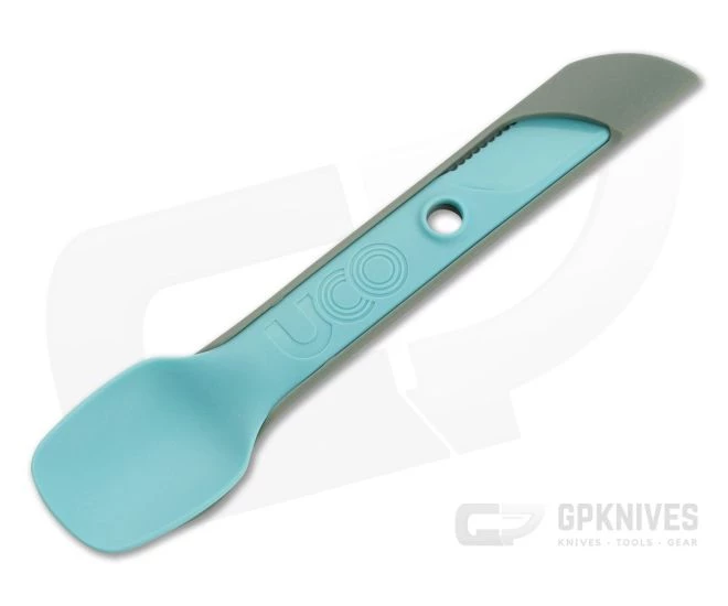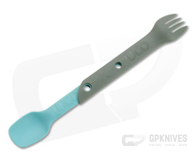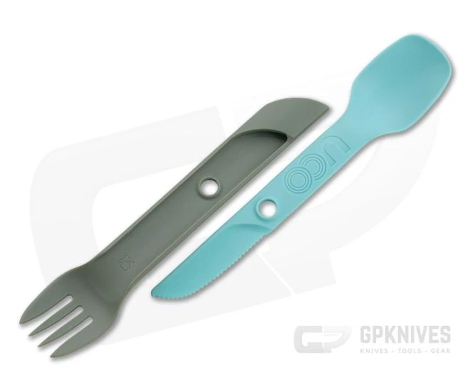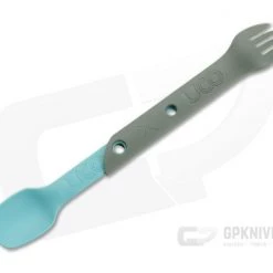 The UCO Switch Spork Set offers 4 tools in 1: Full size spoon, fork and knife; connect the spoon and fork for extra length for reaching into the bottom of deep packages. The spoon edge radius is designed to fit perfectly into the corners of the UCO Mess Kit container (not included) to get every morsel of food. The reusable tether holds everything together, can be used to hang dry the kit and clips easily to a carabiner.