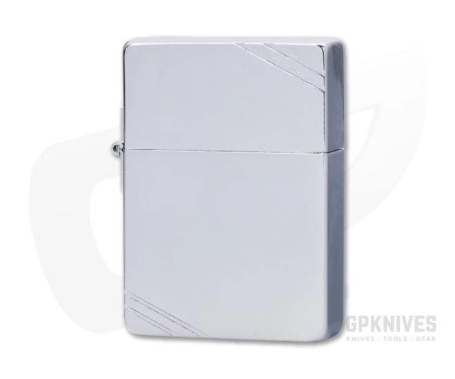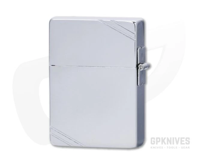 Zippo Lighter with stainless steel construction. Brushed chrome finish with engraved slashes in opposite corners. 1935 Replica with old style hinge. Genuine Zippo windproof lighter. Includes instructions and the Zippo lifetime guarantee.