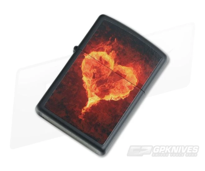 Zippo Lighter with stainless steel construction. Black matte finish with fire heart front artwork. Genuine Zippo windproof lighter. Includes instructions and the Zippo lifetime guarantee.