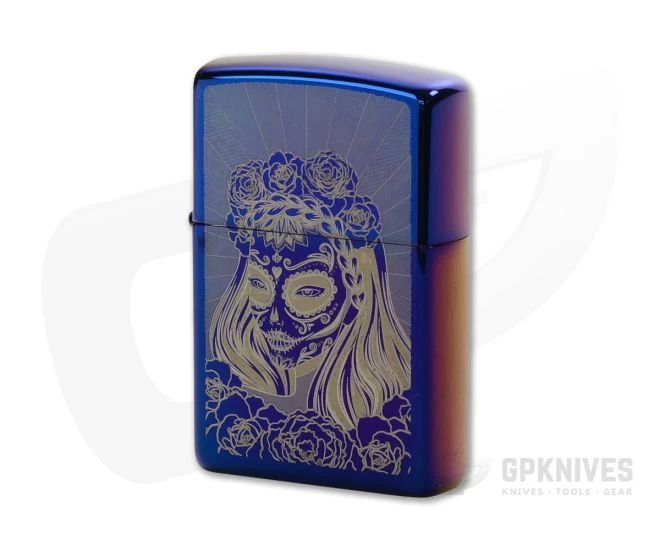 This classic Zippo Lighter with all metal brass construction has a high polish indigo PVD coated body with engraved Mexican Day of the Dead sugar skull girl design. Genuine Zippo windproof lighter. Includes instructions, gift box and the Zippo lifetime guarantee.