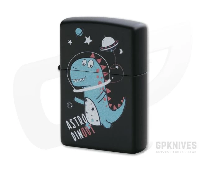 This classic Zippo Lighter with all metal brass construction has a matte black coated body with an astronaut dinosaur “Explore The Universe” design. Genuine Zippo windproof lighter. Includes instructions, gift box and the Zippo lifetime guarantee.