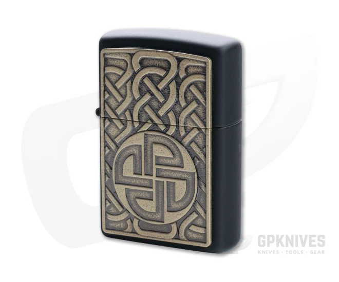 An ancient protective symbol, the Celtic Shield Knot was believe to ward against evil spirits and danger and was often featured on battle shields. More convenient to carry is this Zippo lighter with Celtic Shield Knot embossed, antique brass plate. The body is solid brass with a matte black coating.