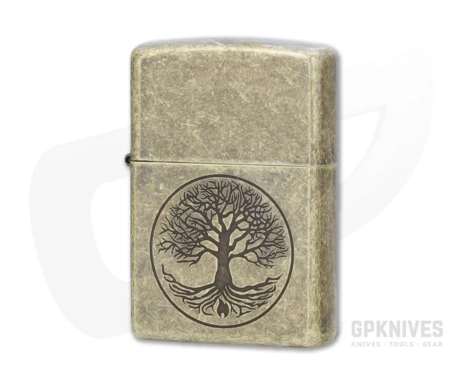 Genuine Zippo Windproof Lighter with brass construction featuring an antique finish and Tree of Life front embellishment. Includes instructions and the Zippo lifetime guarantee.