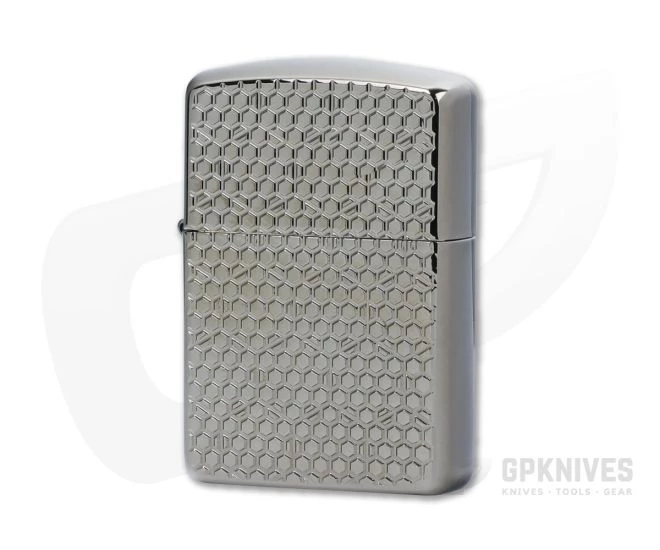 This genuine Zippo Windproof Lighter Armor Case is made with an all metal construction with a glossy, translucent Black Ice finish that has been Deep Carved with a dual Hexagon design. The Armor case is 1.5 times as thick as the standard case. Includes instructions, gift box and the Zippo lifetime guarantee.