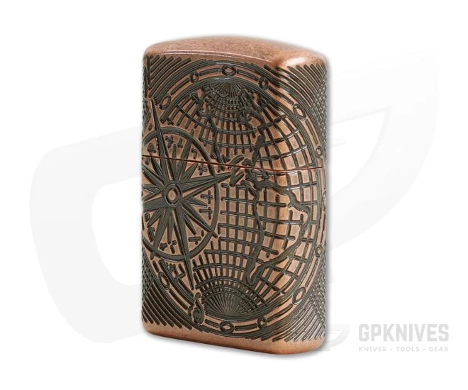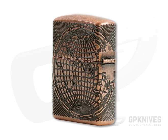 Genuine Zippo Windproof Lighter Armor Case made from Antique Copper that has been 360 degree MultiCut engraved with a World Map motif. The Armor case is 1.5 times as thick as the standard case. Includes instructions and the Zippo lifetime guarantee.