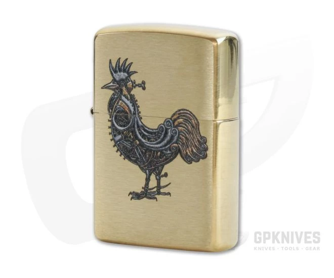 Genuine Zippo Windproof Lighter with brass construction featuring a brushed finish and Steampunk Rooster front graphic. Includes instructions and the Zippo lifetime guarantee.