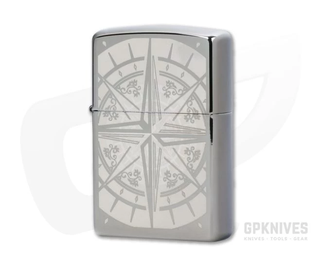 Genuine Zippo Windproof Lighter with all metal construction featuring the mirror Black Ice finish and an intricate, engraved Compass rose graphic. Includes instructions and the Zippo lifetime guarantee.