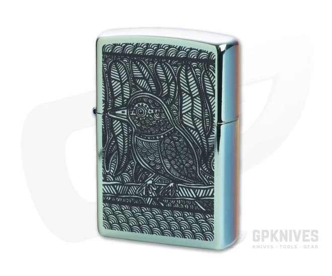 Australian artist and activist John Smith Gumbala blends historic indigenous art techniques with modern media to produce arresting art with a powerful message. This engraved bird design displays his graphic work on the canvas of a High Polish Teal lighter.