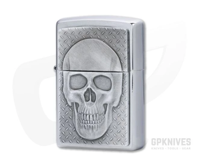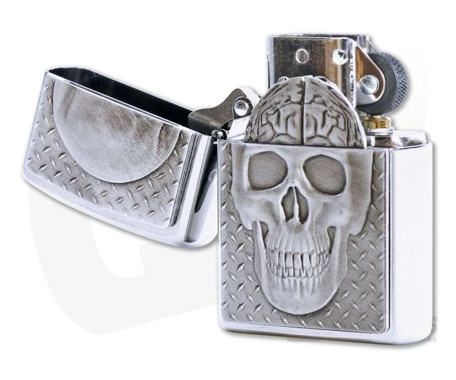 Genuine Zippo Windproof Lighter with Brushed Chrome construction featuring a Skull overlay on the front with a surprise brain on the interior. Includes instructions and the Zippo lifetime guarantee.
